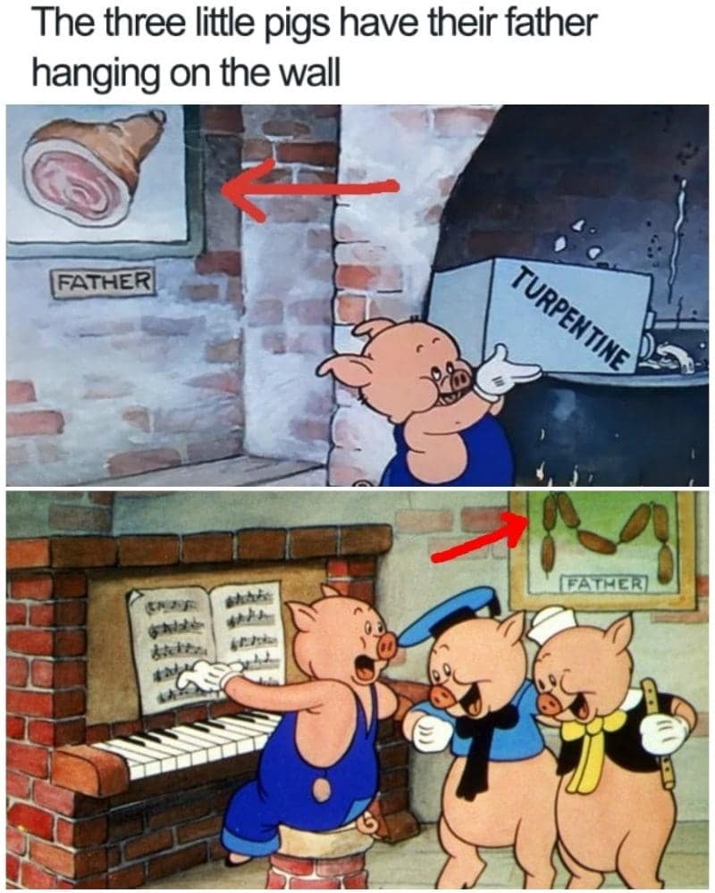 En el corto famoso de los Tres Cerditos, Fifer, Fiddler y Practical Pig son hermanos que construyen sus casas de paja, palos y ladrillos, respectivamente. Solo Practical se esfuerza por edificar un hogar fuerte.