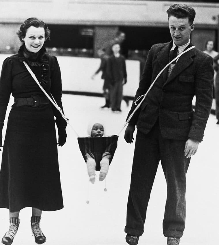 En esta imagen, una pareja aventurera eleva su búsqueda de emociones arriesgando a su pequeño ser querido sobre el helado y despiadado hielo de una pista de patinaje. Imaginar la tragedia potencial por su dudosa evaluación de riesgos pone los pelos de punta.