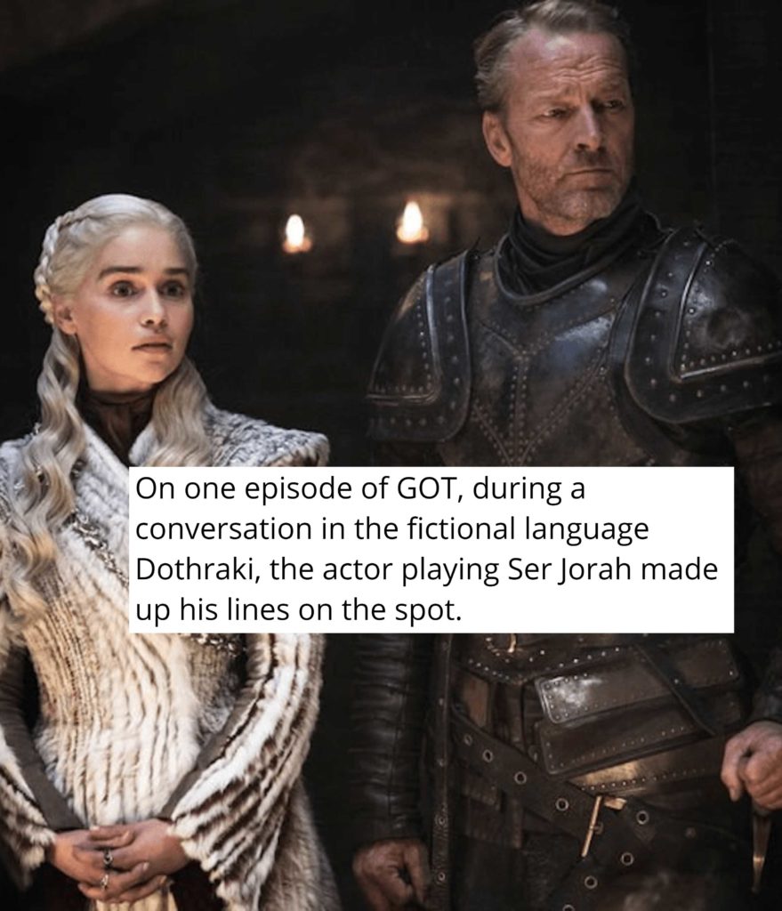 Durante el rodaje de GOT, Iain Glen olvidó sus líneas en Dothraki, un idioma ficticio, sin el creador del idioma a mano. Improvisó hablando en pura invención, pasando desapercibido y dando un rendimiento creíble.