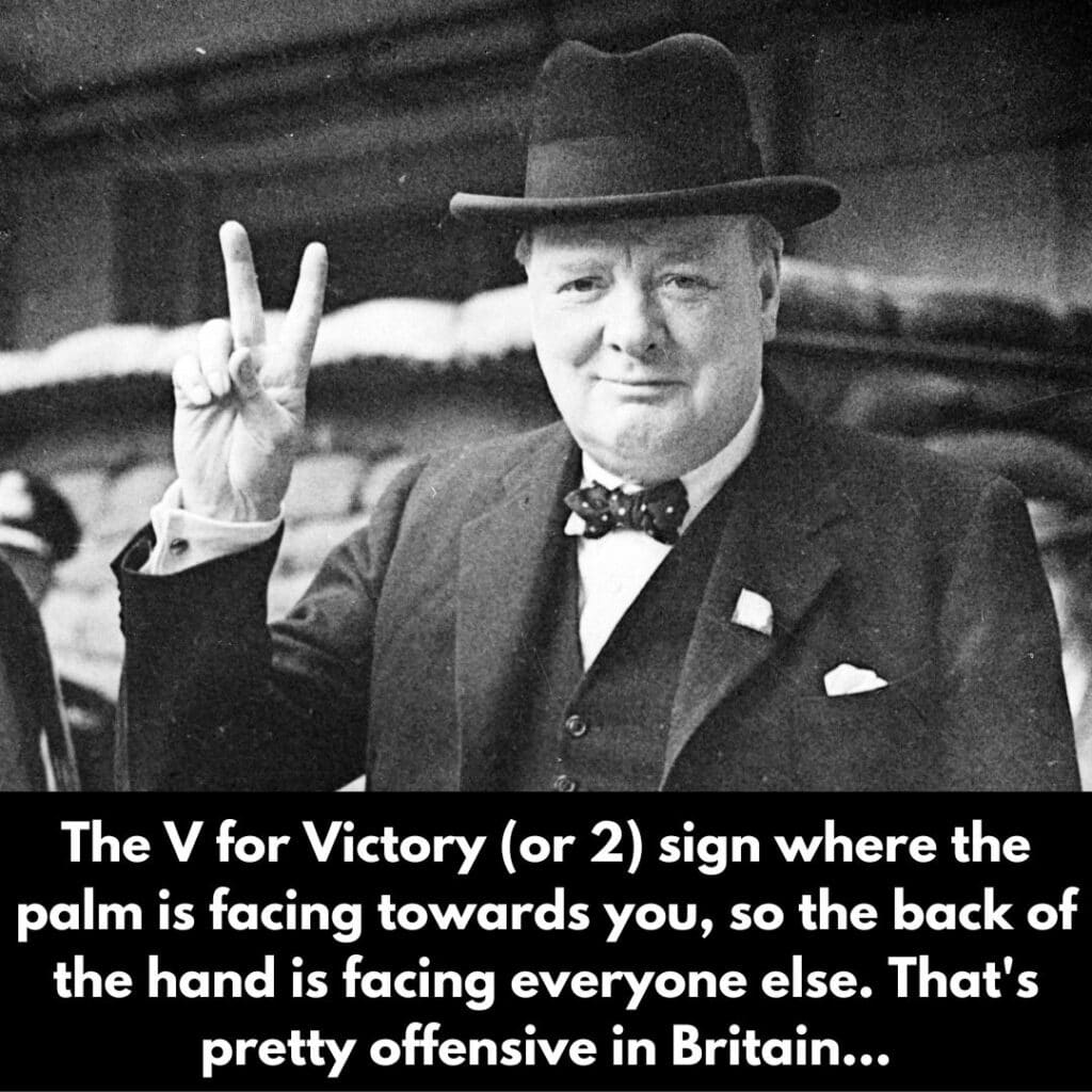 Well, interestingly, this particular gesture–the “V for Victory”–is credited with becoming popularized by Winston Churchill himself. It is a way to convey defiance, derision, or contempt, usually for authority, and was frequently used by the Underground Resistance. While that’s when it was popularized, it might even go further back to 1415 in the Battle of Agincourt.