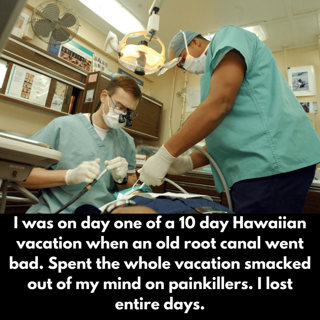 Naturally, she was in incredible pain. The worst part of this whole story is that this dental issue happened on the very first day of her vacation. She didn’t even get to relax on the beach for one day! She spent the rest of her resort-style vacation hopped up on painkillers, half-asleep in her hotel room. Poor thing.